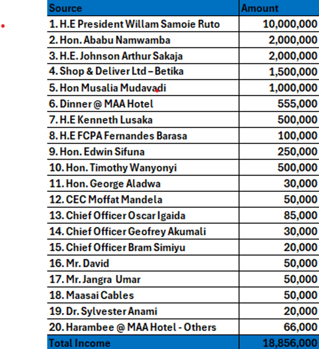 The biggest contributor was the Head of State, President William Ruto, who donated Ksh. 10 million, with Sports CS Ababu Namwamba and Nairobi Governor Johnson Sakaja each giving Ksh. 2 million.