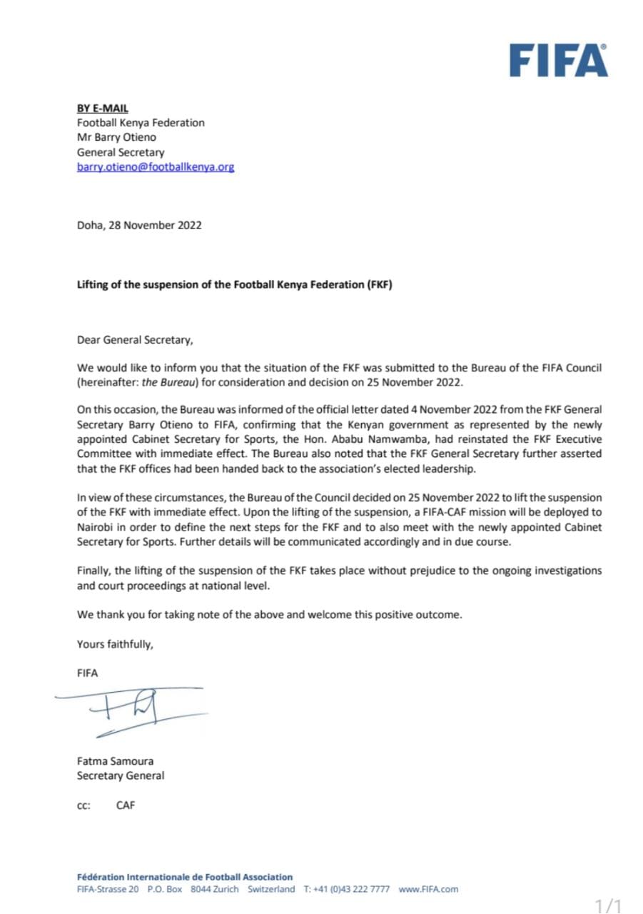 FIFA Secretary General Fatma Samoura communicated the development officially to the FKF General Secretary Barry Otieno earlier today informing him that the suspension had been lifted following a meeting by the Bureau of the FIFA Council on 25th November 2022.