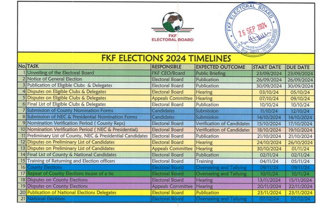 The FKF Electoral Board on Thursday 26 September published the official elections road map and guidelines, ahead of the 2024 polls.