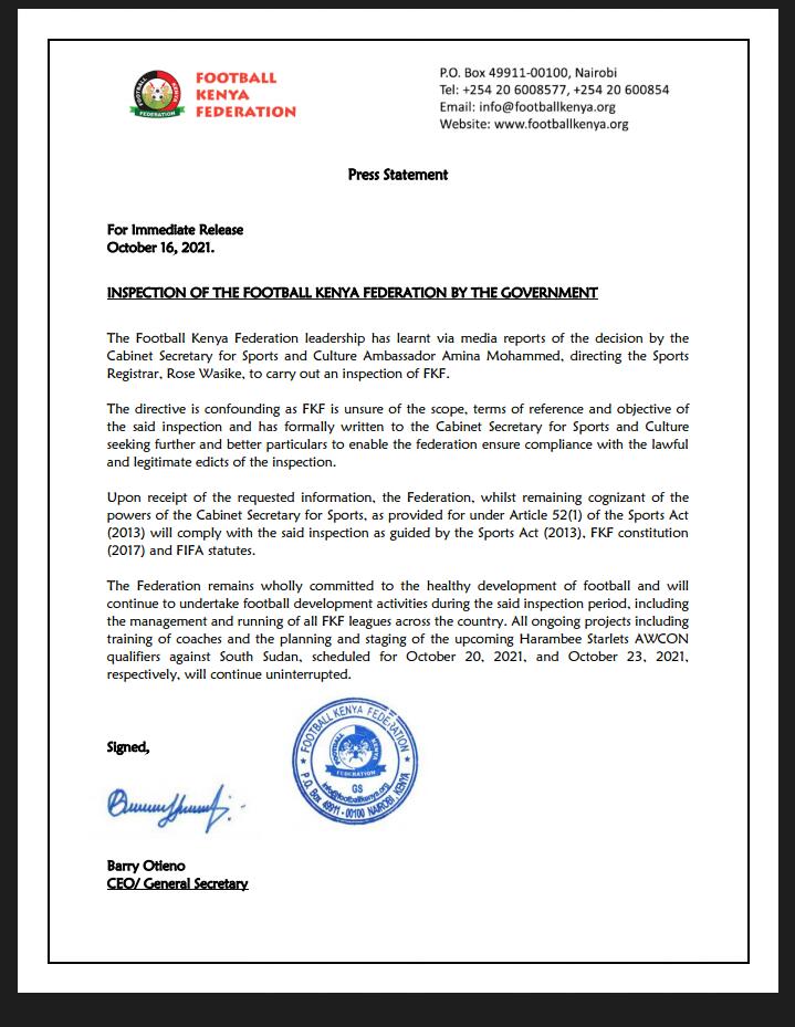 "Today, pursuant to Section 52(1) of the Sports Act (2013), I have directed the Registrar of Sports to undertake the inspection of Football Kenya Federation in accordance to the provisions of the Act,”