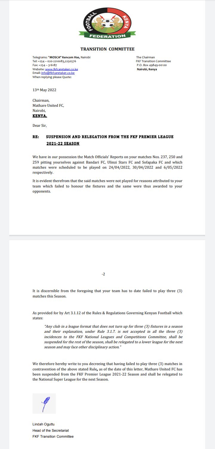 "Any club in a league that does not turn up in three fixtures in a season and their explanation under Rule 3.1.7 is not accepted in all the three incidences to the FKF National Leagues and Competitions, shall be suspended for the rest of the season, shall be relegated to the lower league for the next season and may face disciplinary action," read part of the letter.