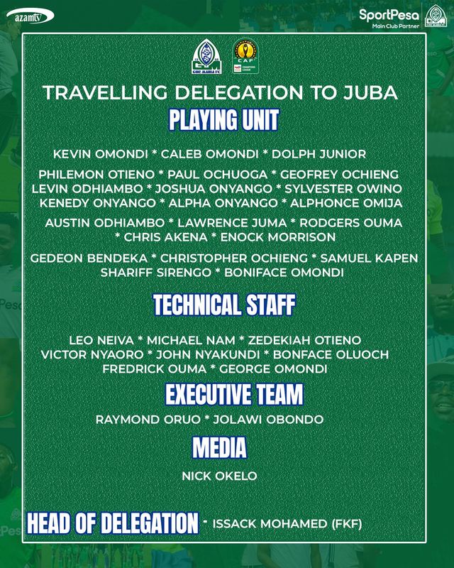 Another notable omission from the squad is the fast-rising wingback Rooney Onyango. However, coach Leonard Martins Neiva will have the opportunity to test some of his new players, including defender Alphonce Omija, midfielders Chris Akena and Enock Morison, as well as forwards Samuel Kapen and Gedeon Bendeka, who joined the club last month and are part of the travelling squad.