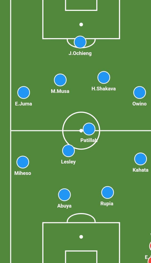 In the buildup phase they looked to set out in a 3-4-3 by playing with Patilah Omotto dropping between the centre back to push the fullbacks higher up the field. This structure also saw Francis Kahata invert and drop deep to form a pivot with Lesley while, Miheso, Rupia and Abuya looked to pin back the backline.
