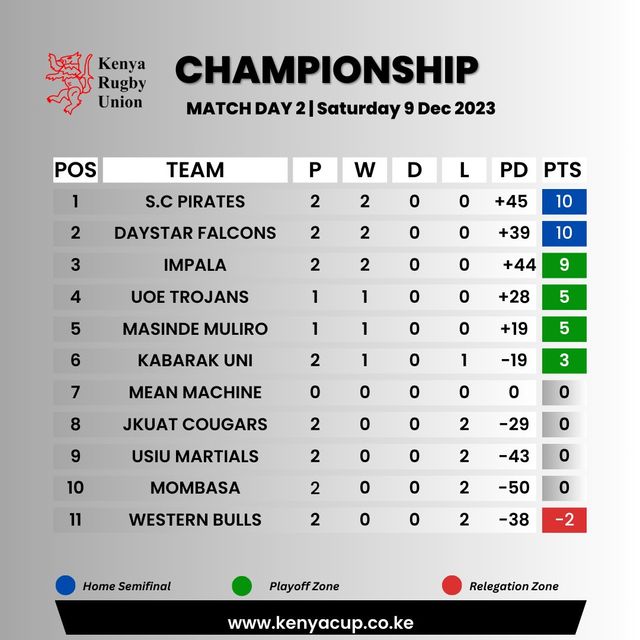 Impala RFC, University of Eldoret (UoE) Trojans, and MMUST Rugby occupy third, fourth, and fifth place respectively.