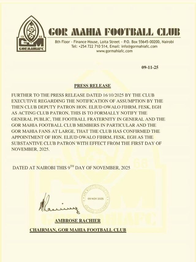 “Further to the press release dated 16 October 2025 by the club executive regarding the notice of assumption by then club deputy patron Hon. Eliud Owalo as acting club patron, this is to formally notify the general public, the football fraternity, and Gor Mahia members and fans that the club has confirmed the appointment of Hon. Eliud Owalo as the substantive club patron with effect from the first day of November 2025,” read the statement.
