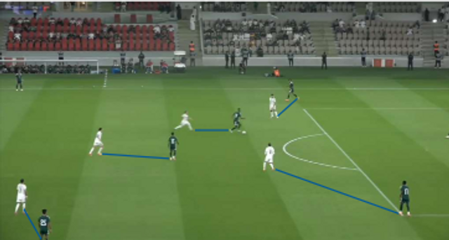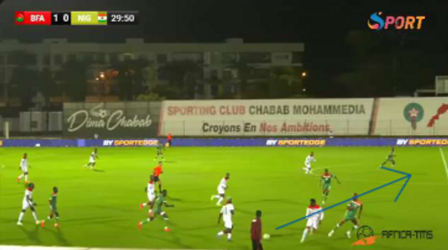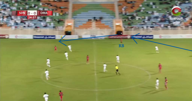 Sudan rely on their goalkeeper’s direct long balls to release runners attacking the space behind the defence, while the right-back aggressively pushes forward to add an extra body in the final third and sustain the vertical momentum