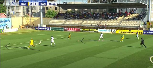 Before halftime, Nairobi United continued to threaten with wing switches and early crosses, while Bandari relied on long goal-kicks and diagonal restarts to bypass pressure.