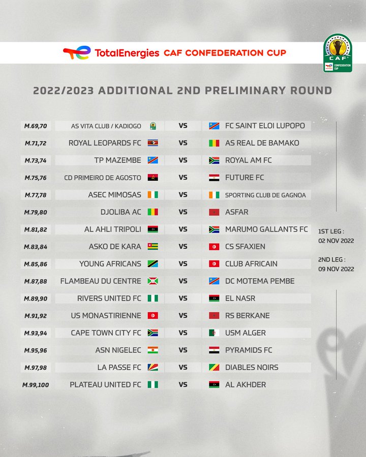 An interesting clash in the draw will see an Ivory Coast derby between ASEC Mimosas who were eliminated from the Champions League by Horoya AC square it out against Sporting Gagnoa.
