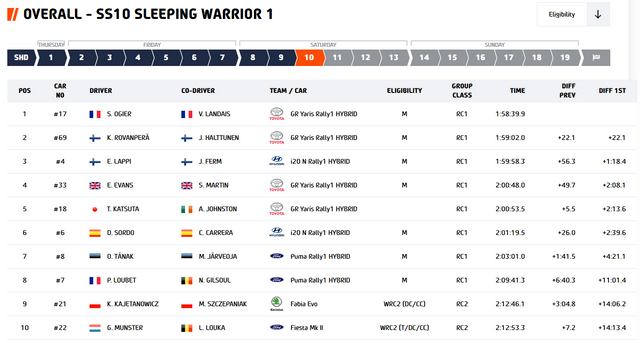 Consolidation was the priority for eight-time world champion Ogier at Elmenteita and Sleeping Warrior, however, where he gave away a handful of seconds to Rovanperä. The Frenchman reached the respite of service still carrying a 22.1sec advantage, only seven-tenths of a second worse off than when he started the day.