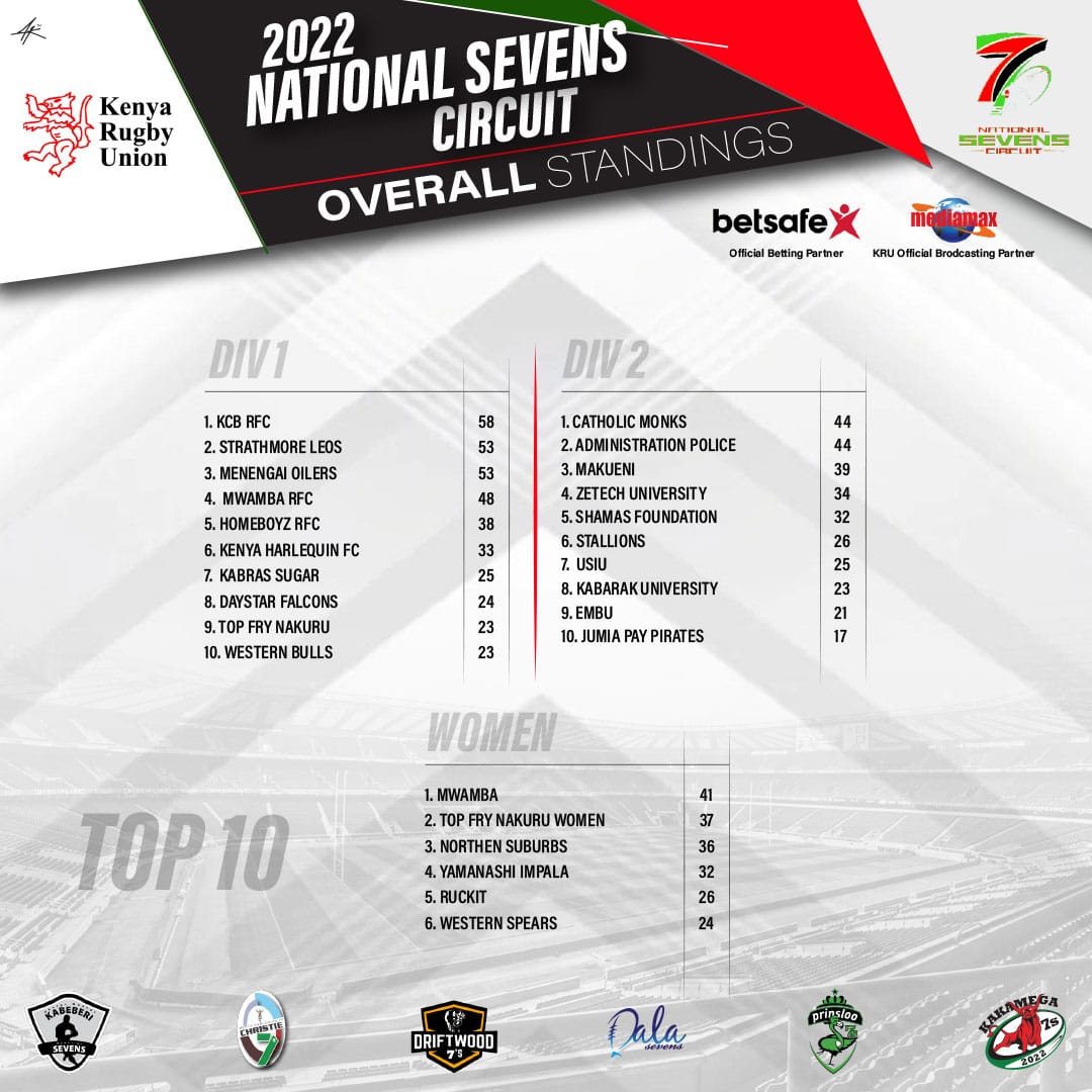 As things stand, it is overall defending champions KCB RFC who top the pile on 58 points, five ahead of second and third placed Strathmore Leos and Menengai Oilers who are tied on 53 points after the opening three circuits.