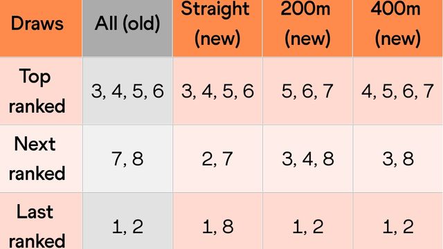 The seeding for lane draws in track events has been amended to create a different allocation after the first round, following submissions from elite athletes and coaches.