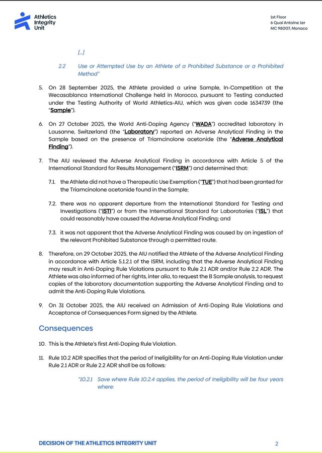 In a statement dated Wednesday, 19 November, 2025, the AIU said it notified the athlete of the adverse finding on 29 October stating that the result could lead to anti-doping rule violations under Rule 2.1 or Rule 2.2 of the Anti-Doping Rules.