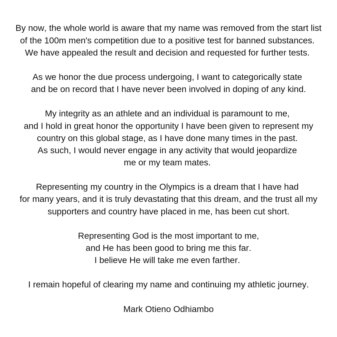 Kenyan 100M runner, Mark Otieno has failed a doping test after his sample returned an advance analytical finding. Mark was scheduled to compete in the preliminaries this afternoon. #Olympics #Athletics
