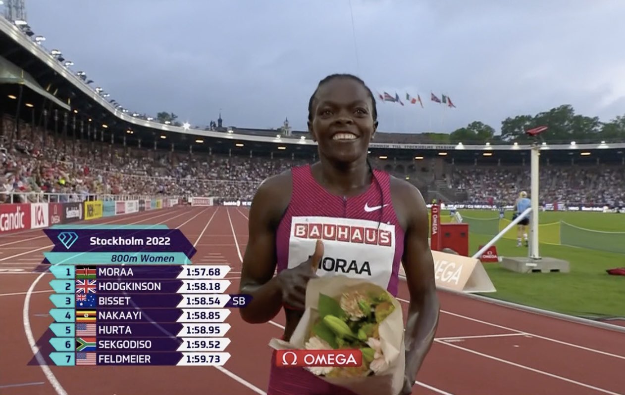 Mary Moraa is the real deal. After winning the 400/800 double at the Kenyan champs over the weekend, she wins the 800 in Stockholm in 1:57.58, handing Keely Hodgkinson her first 800m defeat of the year.https://t.co/fRjPV46FQ0 pic.twitter.com/l8SAHFvXxl