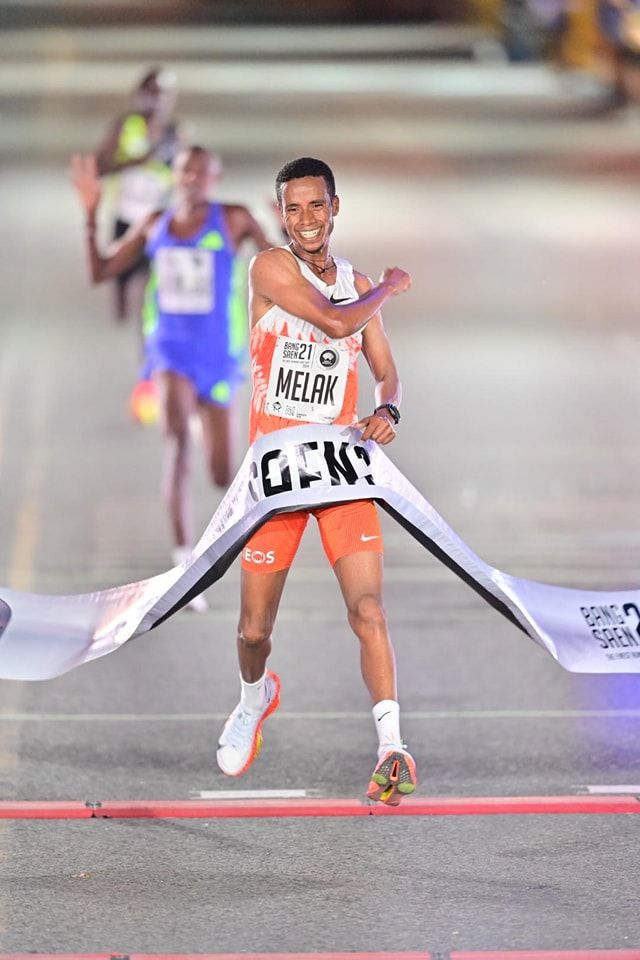 The trio, who dropped Leul Gebresilase as they passed the 15km mark in 45:07, ran side-by-side with the finish line in sight, before Melak kicked for a second time to create a clear gap, eventually winning by two seconds.