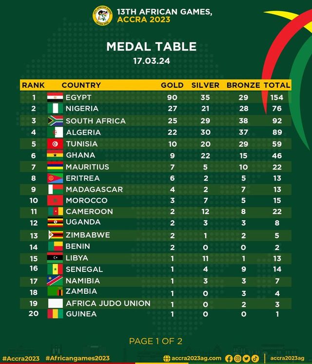 All African Games Medal Standings as of Monday