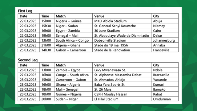 2015 Champions Nigeria will play host to Guinea in Abuja on Wednesday afternoon before facing them next Tuesday in the return leg to be held in Morocco.