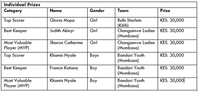 Both Bandari Youth and Changamwe Ladies have each pocketed Ksh 250,000, and will represent the Eastern region in the National finals slated for early next year. The runners-up: The Young Gunners and Bulls Starlets also took home Ksh 150,000 each. The Most Valuable Player (MVP), Best Goalkeeper, and Top Scorer (boys and girls) each received Ksh 30,000.