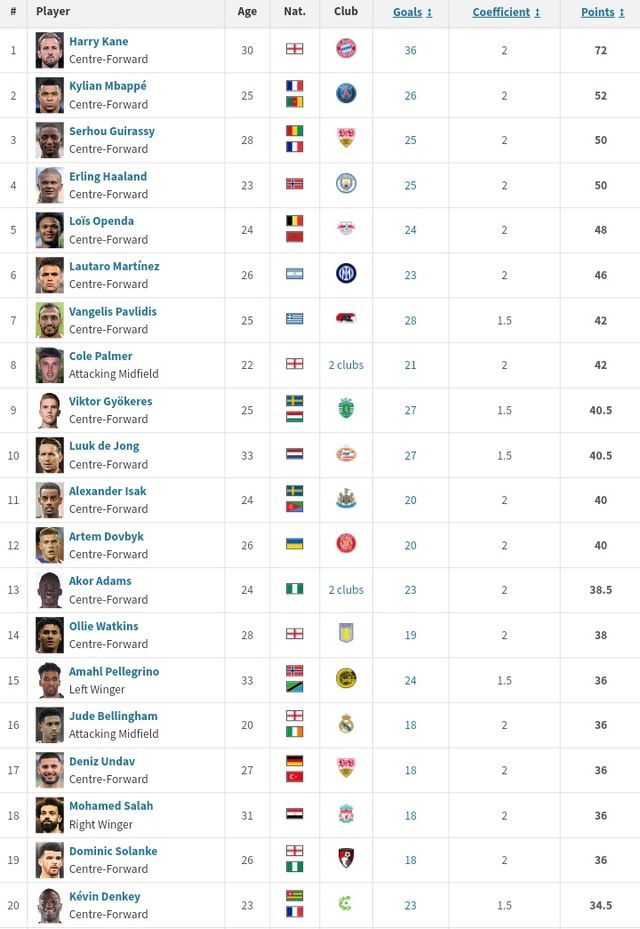 Note: Goals in the 'TOP 5' leagues on the UEFA ranking are multiplied by a coefficient of two, from the sixth to the 22nd league goals are multiplied by one and a half, and all others by one.