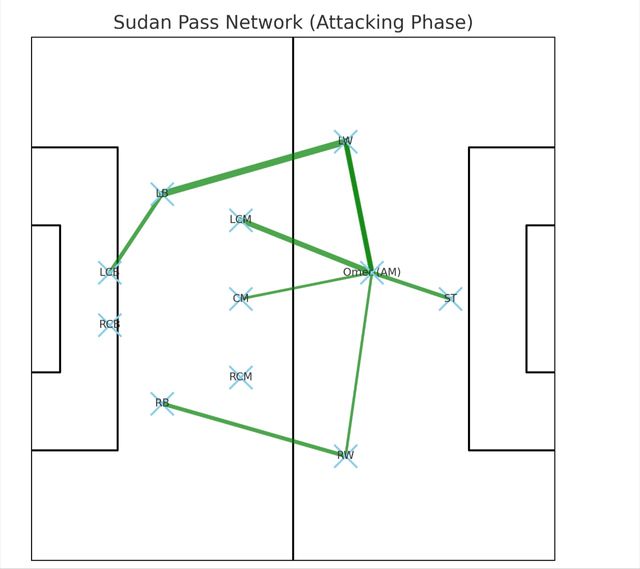 Central to Sudan’s attacking efficiency was Abdelrazig Omer, who operated as the most advanced midfielder. Omer’s role was tactically intelligent—he alternated between creating overloads in wide areas to link with Hussein and positioning himself centrally to exploit second balls.