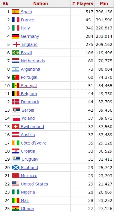 Algeria is close by (28th with 24 players), Cameroon follows (30th - 23) and then African participation on the list starts dropping significantly.