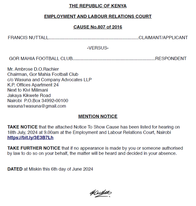 Gor Mahia Chairman Ambrose Rachier has been summoned to appear before the Employment and Labour Relations Court in Nairobi on July 18, 2024, at 9:00 a.m. to show cause why he should not be jailed for failing to pay the club's former coach, Francis Nuttall, compensation for wrongful termination as per the court rulings, Mozzart Sport exclusively reveals.