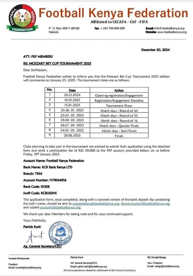 Football Kenya Federation (FKF) has opened the registration window for the 2024/2025 Mozzart Bet Cup as of Friday, December 20, 2024.