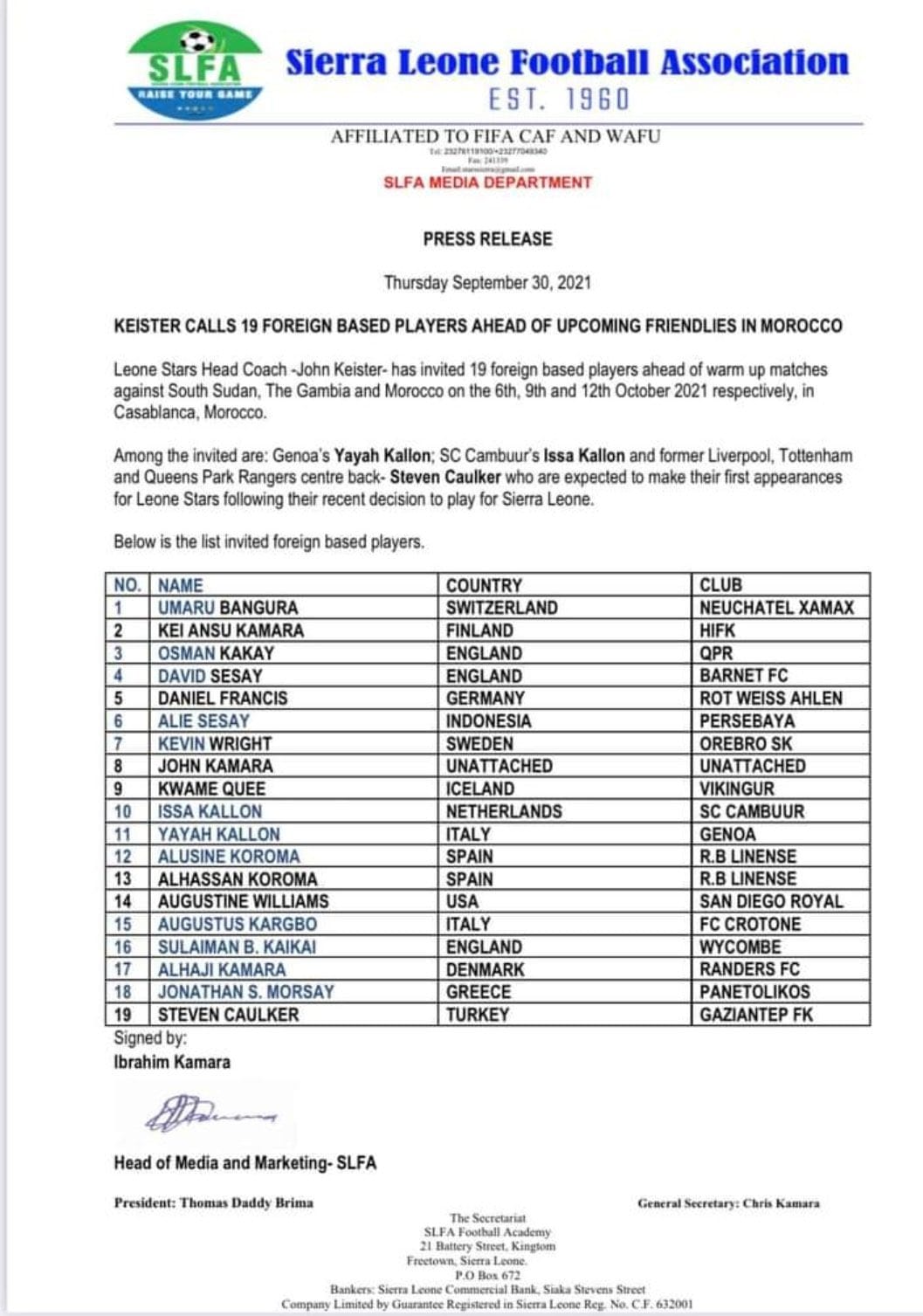 — Sierra Leone Football Association (@SLFA_sl) September 25, 2021