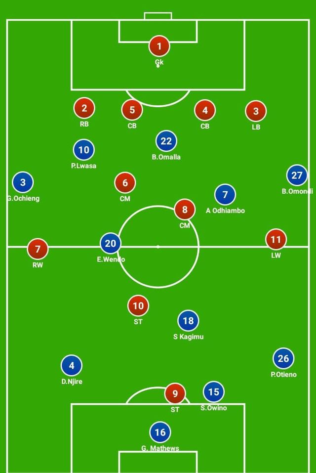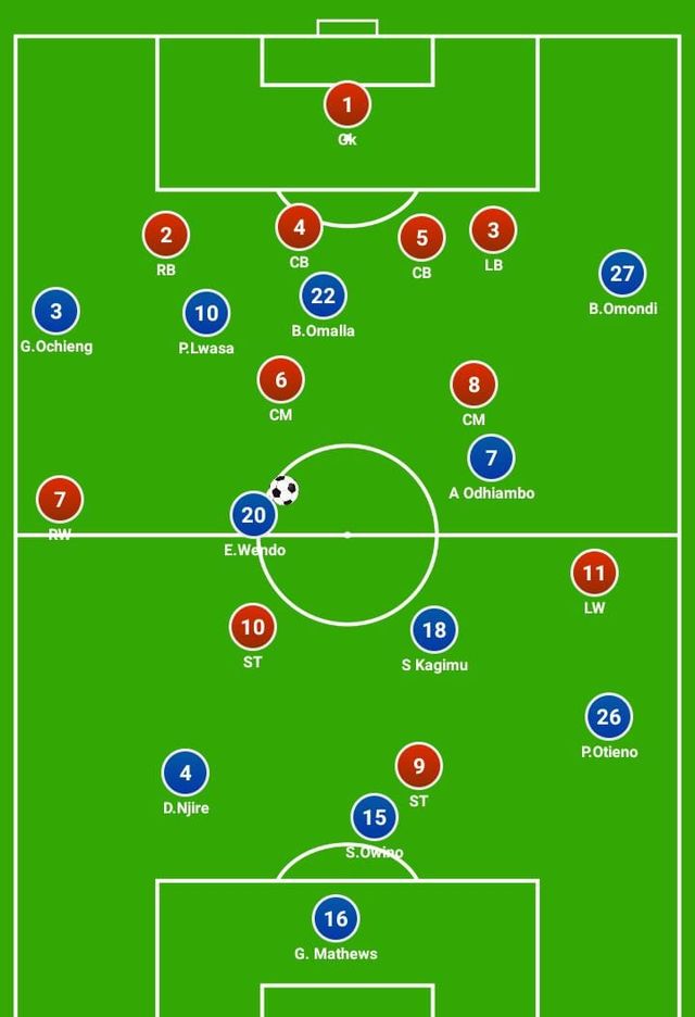 When Gor Mahia are in their rhythm, they are simply unplayable, no one can come close. The midfield double pivot looks to play the opponent out of the park. Their vertical approach sees the ball passed around quickly when they notice a chink in the opposition armor, they want to exploit this as soon as possible. In most instances Gor Mahia has been found to play just three passes to get within shooting range. The double pivots understanding with talisman Austin Odhiambo is also very key in the in possession structure. Austin can drop deep into the pockets to receive the ball , drive at opponents and also switch play . With the risk of always losing the ball in this phase, Gor Mahia have always looked to push Wendo or Kagimu closer to him so he can sniff out the danger of transition.