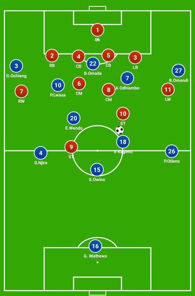 The vertical approach has worked well for Gor Mahia, seeing them come up as the second highest scoring team in the league with 53 goals. However, there are instances where a more measure approach in attack was needed and they had the tactical maturity to employ it. This is because of the status of Gor Mahia, most teams would resort to playing in a low block, and thus there was need for a clear structure in how they attack. In the final phase, they maintain the back three. Kagimu and Wendo form the double pivot, acting as options to recycle play. The left back Geoffrey Ochieng pushes slightly higher up , this happens mostly when Philemon Otieno is playing at right back, if it is Paul Ochuoga this may change the dynamic. Boniface Omondi provides the width on the right, also note that they employ heavy rotations among their forwards when in play. Benson Omala pins the opposition centre backs with Austin dropping between the lines with a Peter Lwasa or a John Macharia playing in the halfspace. In this phase, when either Wendo or Kagimu have the ball they look to draw out one of the opposition midfielders , this enables the creation of an overload against the opposition last lines of play.
