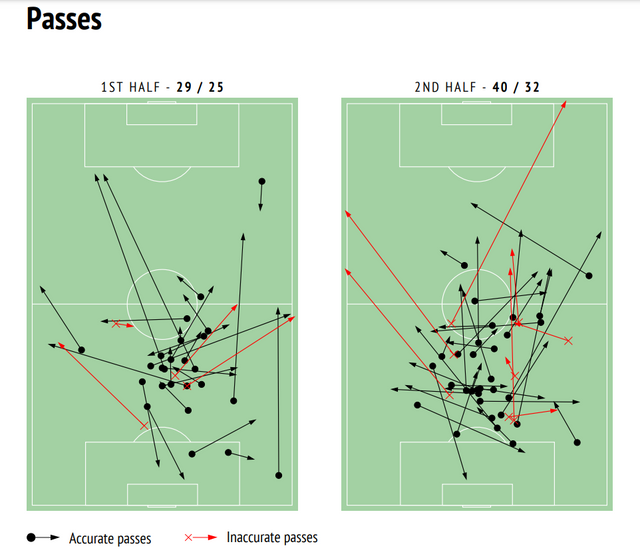 The second half was not the calmest one on his passing graph, with perhaps the pressure by the entire team to get a goal back and get a result at home forcing them to be erratic as they attempted to send more balls forward, and also with West Ham's quality showing.