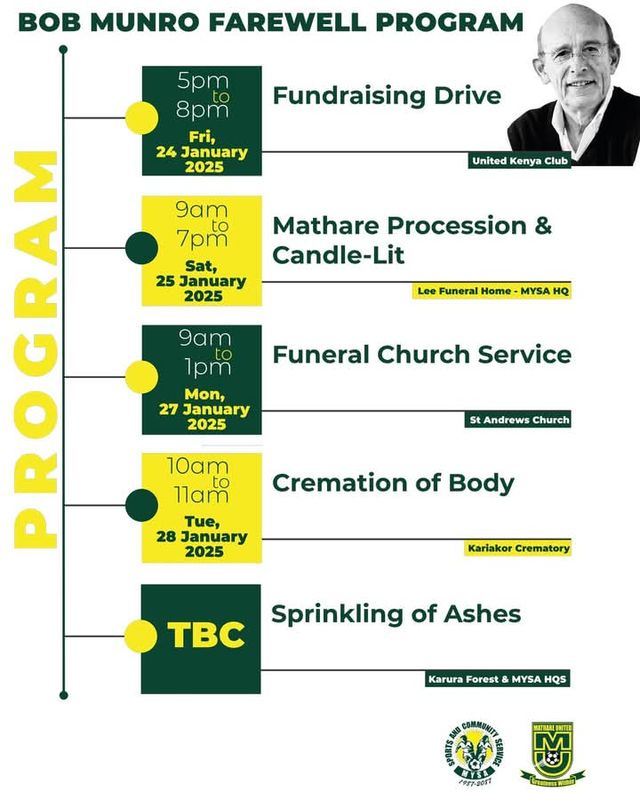 The funeral programme for Mathare United's founder the late Bob Munro has been released including the day of his cremation.