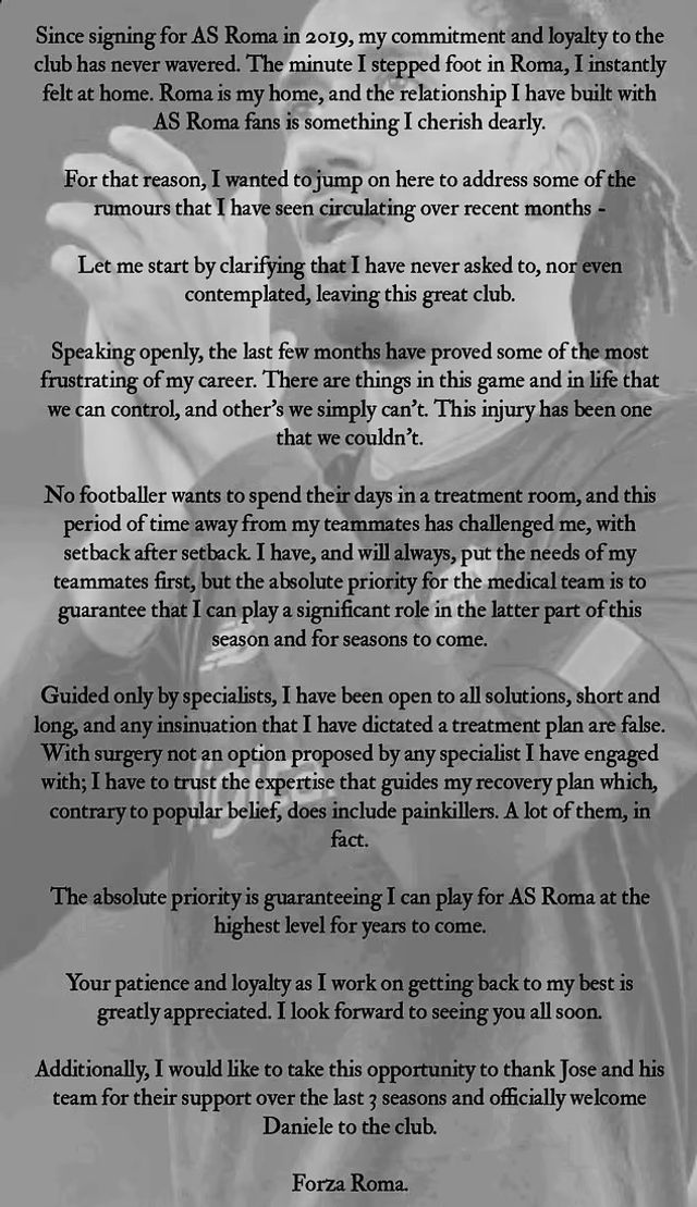 The defender thanked Jose Mourinho and his team for their support over the past three seasons and welcomed new Roma manager Daniele De Rossi. Smalling expressed gratitude for the patience and loyalty of the fans and reassured them of his commitment to returning to his best form.