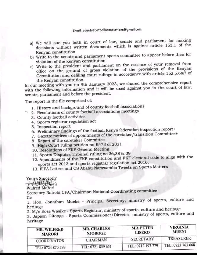 "On 27th Thursday of October 2022, you were sworn in to defend the constitution of Kenya. In the football matters, you have completely violated it by not adhering to it in many circumstances. We hereby demand you to act upon the following heating matters in the football circle with emergency;
