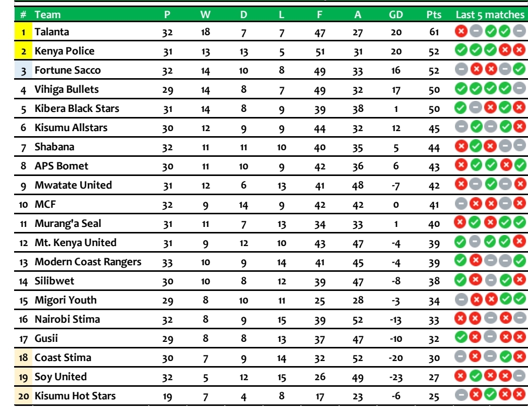While Coast Stima has been having a torrid performance lately and are in the relegation zone with 30 points from as many games, Mount Kenya United have managed to perform when it matters and sit comfortably 12th on the log with 39 points.