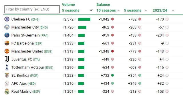 During half a decade, the London club had a turnover of 2,572,000,000 euros, with a minus of 782,000,000, and according to those two criteria, it is unmatched in the whole world. Behind the Blues, at the top of the spenders' list is a quartet of Premier League competitors: Manchester United (-773,000,000), Arsenal (-622,000,000), Tottenham (-608,000,000) and Newcastle (-574,000,000).