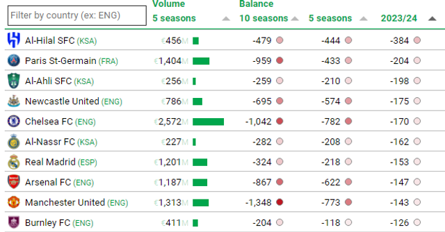 When it comes to cash flow, Manchester City are first behind Chelsea with 1,726,000,000 euros, followed by Paris Saint-Germain, Barcelona and Manchester United. In the current season, the biggest spender was Al Hilal, which invested 384,000,000 euros in reinforcements, followed by Saudi-owned clubs Paris Saint-Germain with a deficit of 204,000,000, Al Ahli, which is 'in the red' with 198,000,000, and Newcastle (175,000,000) behind which stand the biggest spender in the previous five years, the club from Stamford Bridge.