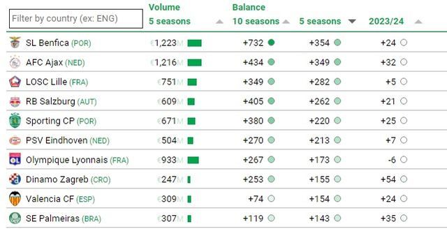 On the other side of the list, the clubs that made the most profit in the previous five years are led by Benfica with 354,000,000 euros collected, followed by Ajax (349,000,000) and Lille (282,000,000). Salzburg, Sporting, PSV, Lyon, Dinamo Zagreb, Valencia and Palmeiras.