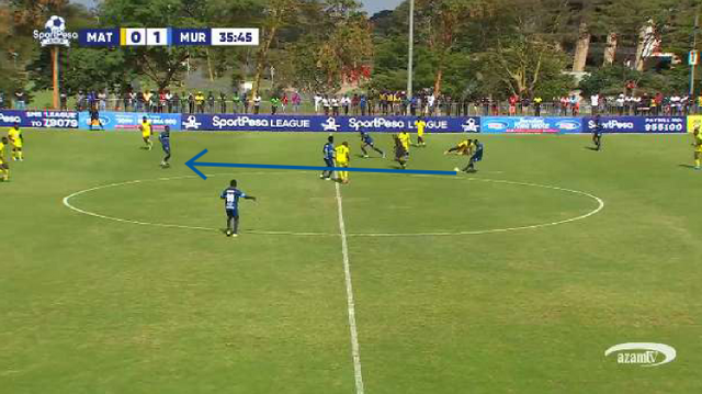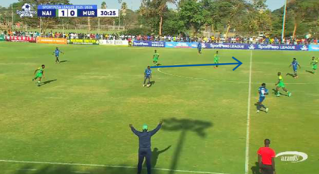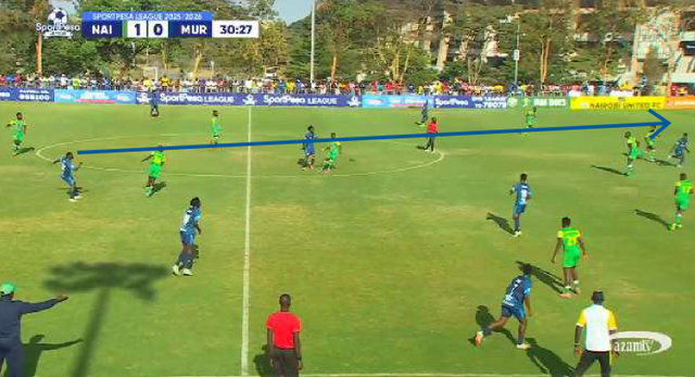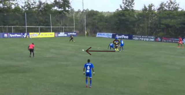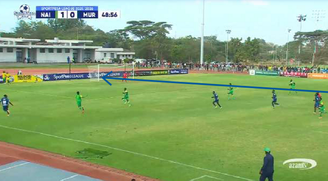 Telvin Maina delivers a measured long pass into wide space, targeting a free man and stretching the opposition’s defensive structure horizontally