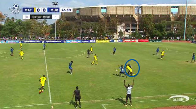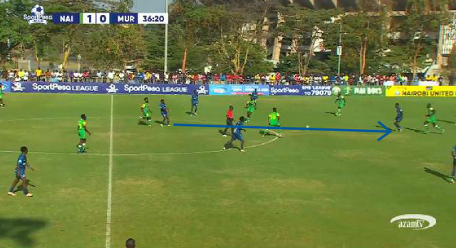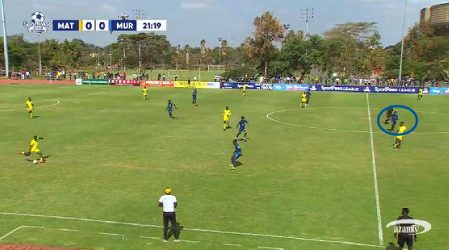Telvin Maina’s off-ball awareness allows him to track Mathare United’s creative midfielder Brian Ouru closely, denying him time and space between the lines through smart positioning rather than constant tackling