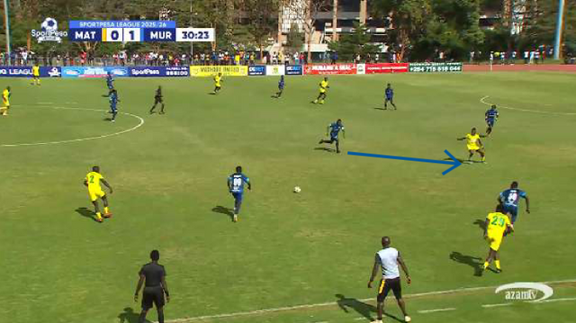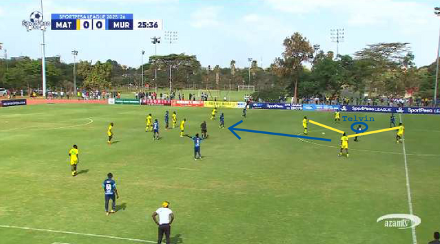 Telvin Maina accelerates the point of attack by threading a forward pass into an onrushing receiver between the lines, piercing the opponent’s pressure and shifting play into advanced central zones