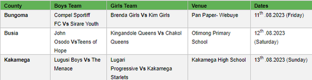 Twelve teams from the three counties are expected to battle it out, with the winning teams joining Vihiga County qualifiers Madira Soccer Assassins and Ebwali Boys to play in the regional finals scheduled for the 26th and 27th of August at Bukhungu Stadium.