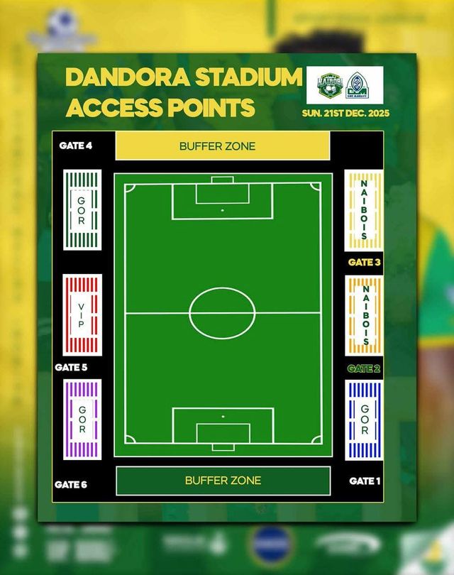 As per the seating arrangement shared by Naibois, home fans were restricted to two stands (orange and yellow), with Gor Mahia occupying three others (blue, purple and green).