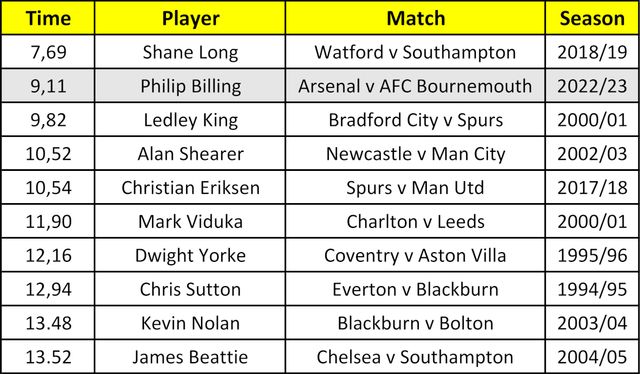 Philip Billing struck one of the fastest goals in Premier League history when AFC Bournemouth opened the scoring after just nine seconds against Arsenal. The Cherries broke down the right from kick-off and stunned the Emirates Stadium crowd with a cross that caught out the Arsenal defence for Billing to apply a simple finish.