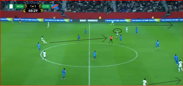 Alex Iwobi dropping deep as the advanced organiser, receiving with his back to goal to recycle possession with the centre-backs before releasing runners into the wide channels in Nigeria’s recent World Cup qualifier knockout match against DRC