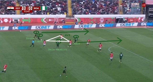 Although the goal was ruled out for a foul by Onuachu, it served as a case study of Nigeria repeatedly accessing dangerous zones through wide-to-central progression.