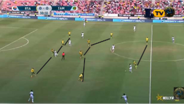 The midfield overload becomes the base for isolation patterns on the wings, allowing South Africa to switch play and destabilise opponents with structured, patient circulation.