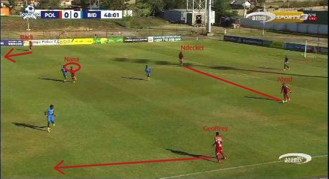 The core weakness Police attempted to exploit was Bidco’s wide-to-central defensive shifting. Because Bidco prioritised central compactness, their wide defenders were frequently isolated once rotations drew midfield cover away.