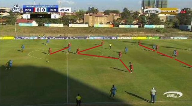 Police’s territorial dominance was most evident in the left half-space. Omondi, Chonjo, and Onyango consistently occupied staggered vertical positions, ensuring one player was always free between Bidco’s lines.