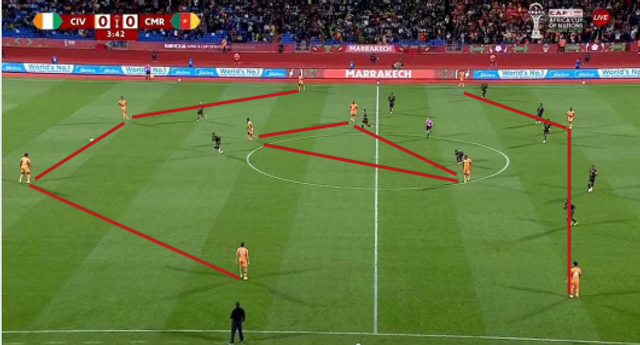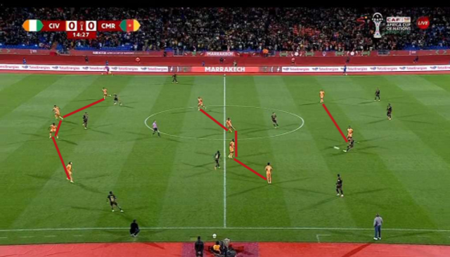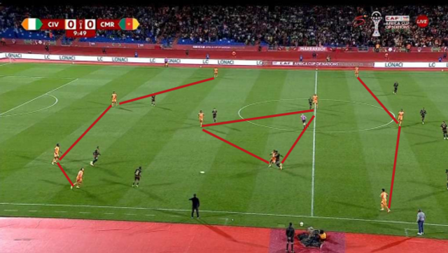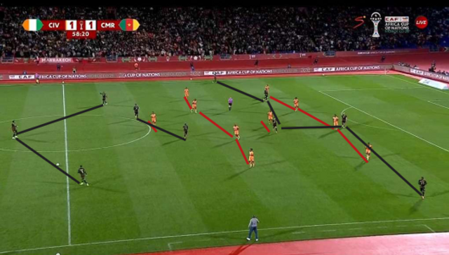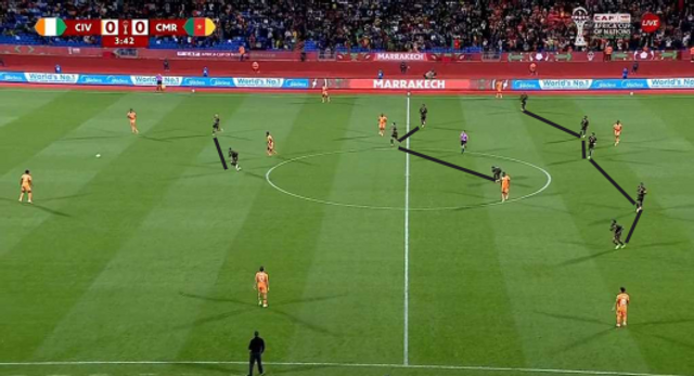 This deep, man-oriented setup frustrated the Elephants' initial attempts to build through Sangaré and Seko Fofana, forcing play wide and reducing clear chances in the opening exchanges. As the half wore on, Cameroon gradually transitioned to higher pressing, while Ivory Coast responded by shifting into a 4-4-2 mid-block that saw wingers stepping out to press the wing-backs and funnel attacks predictably.